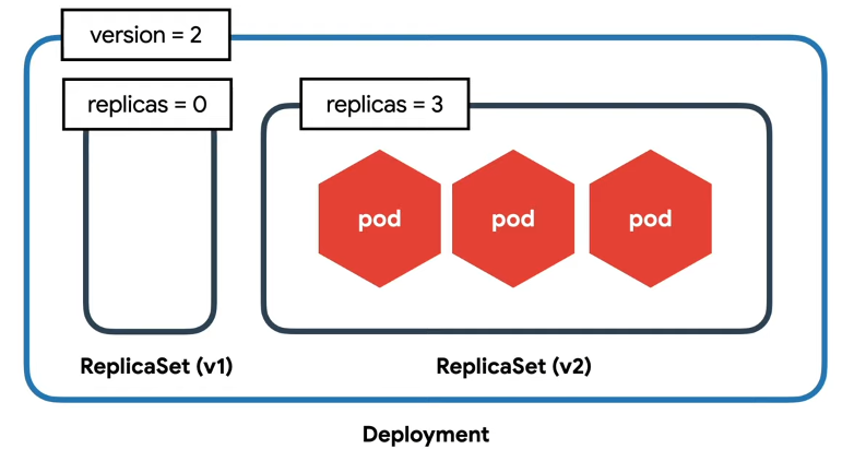 요약하면 Deployment 안에 ReplicaSet이 있고, 그 ReplicaSet 안에 replicas 의 수 만큼의 Pod가 관리되고 있는 것이다.