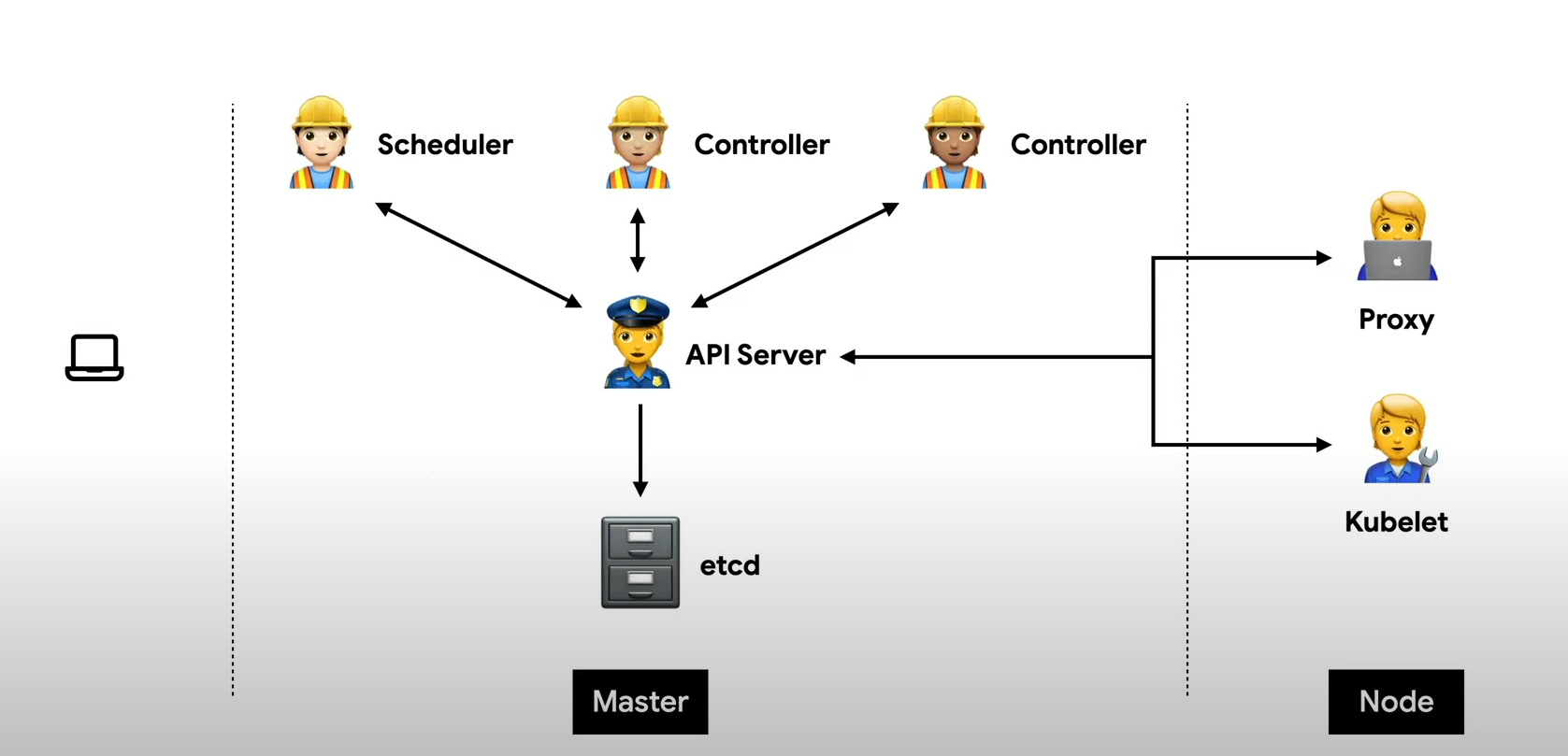 정리하면 API Server 는 etcd 에 저장된 상태들을 조회하거나 수정하고, 상태들을 Desired State 로 지속적으로 체크하는 Controller 가 있고, Pod가 적절한 노드에 배치되도록 하는 Scheduler 가 있다. 그리고 etcd는 오로지 API Server 만 가능하다.